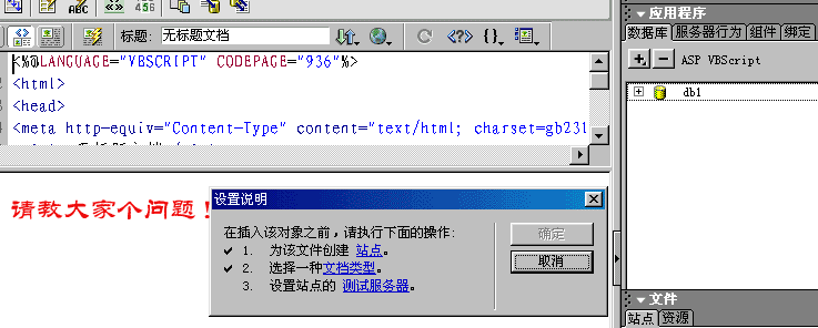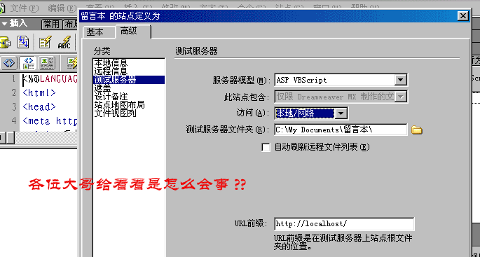 跟我前几天遇到问题一样。共有四步要你做吧。前两部你照作就是了:建站点你总会吧,建文档类型就选择ASPVBSCRIPT。第三部是关键:在测试服务器选项中也选择ASPVBSCRIPT,然后在下面的复选框中选择“本地网络”就OK了!第四部你就可以在+号中选择东西了。