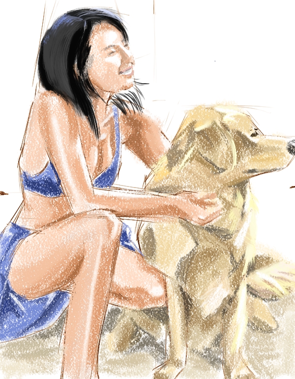 图片如下:  尝试了下画彩色的..&写实的...... 虽然尽力表现体积...8知道方法对不对....可能有的地方违背了光影规律.. 对于取色还是不准...有种取了亮色和暗色后就觉得中间色好象...不是接近亮的就是接近暗的....分辨不出来....呃..... 还有人物和狗的结构也不太熟~ 8过画的时候找回了小时候拿蜡笔画画滴感觉~PT的笔刷好多啊..... 哦对了,补色还是不太会...感觉画上去很8搭调...|||