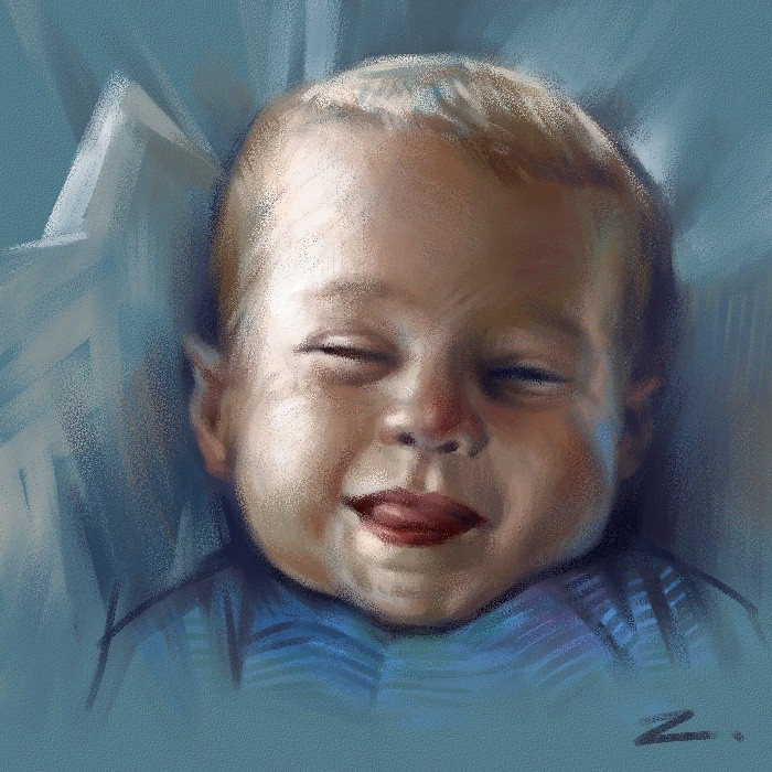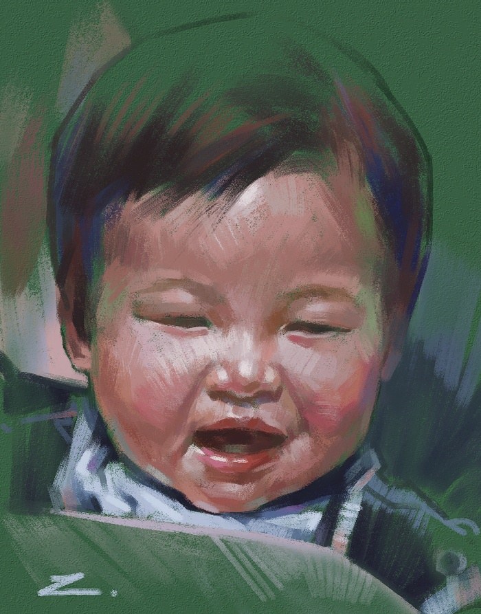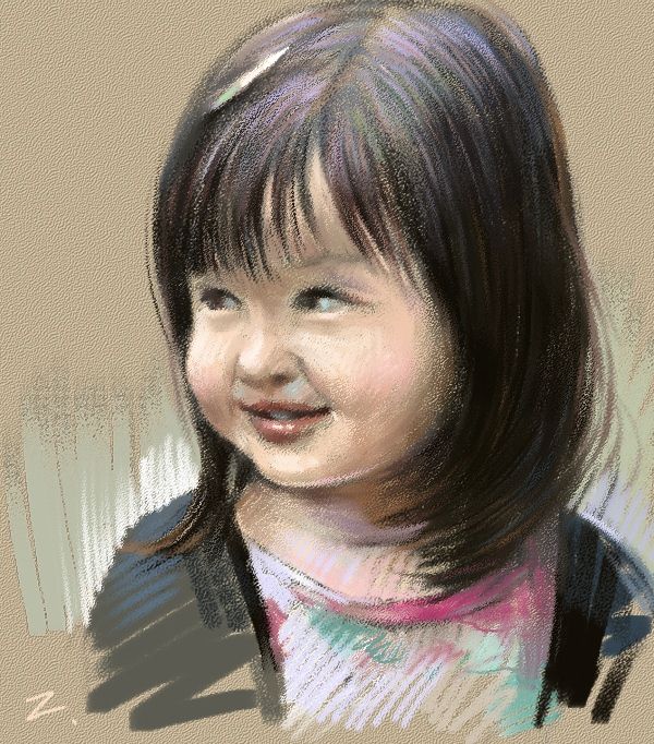 图片如下:  这张是为子函的孩子绘制的色粉肖像,参考了照片。比较满意色彩的搭配和体积感的处理。