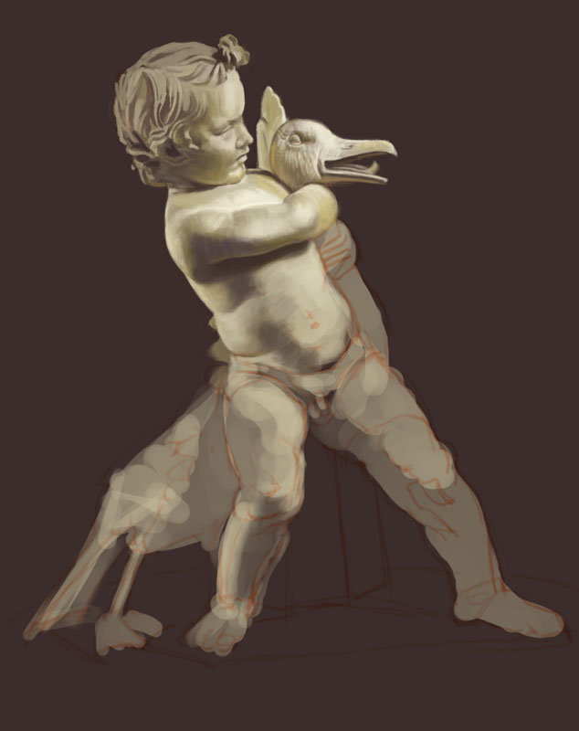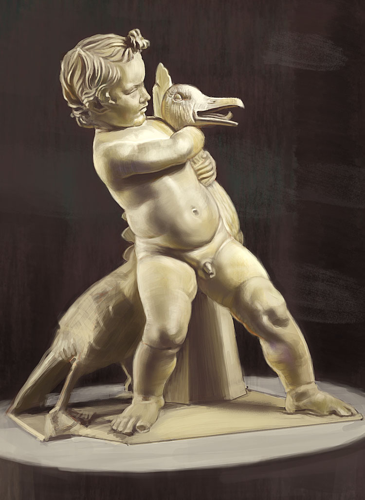 gk7:原图在kentcai1977的那个帖子里面都可以找到,我没有乱加东西恶搞…… chyijoe:欢迎回来~~~! 新图的baby很可爱~~~! 不过脸部感觉像抠图,和周围的毛绒衣服没有结合好,下巴部分应该有白色的环境色反光吧?包括一些脸部边缘线,不要画那么【整齐】。 lingy:thanks~~~! 喜欢239的中景礁石的表现,近景稍微潦草了些,适当再添一些细节特征会更好。 coolers:T2画得不错,就是硬边太多了,适当配合一些软边缘,可以有一些虚实对比。 —————————————————————————————————————————— 【NO.593】Painter 6.01《雕像练习》 N久没有用painter作画,今天心血来潮。主要使用了自定义的Basic Round,缺省的Oil Pastel和Palette Knife,Basic Paper的纸纹。 图片如下: