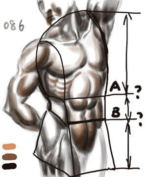无光泽快餐:谢谢指正!临摹大师的人体素描感觉就是不一样啊.....一块一块的多清楚啊...你的027感觉质感笔刷用得好像有点过了,整体颜色氛围还是很棒的! 086继续临摹一个... 软件:PS7.0 时间:2个小时吧 图片如下: 另外想问大家一个问题:通常打大比列的时候,把身体主躯干分几个部分,就像我这个图画的几根线。当然这个姿势变形比较大。主要疑问在腹部那里,A线是一般都分在腹部那块大肌肉中间偏下的沟那里?B线一般分在下腹部那块大肌肉的上部凸起的最高点那里?先谢谢了哈  图片如下: