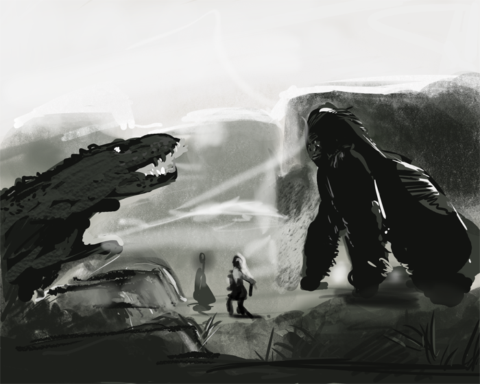 金刚大战鳄鱼,蛮有想象力的,前景确实可以实在一点。一起加油!