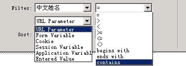 谢谢!看一UD的教材,做一搜索,显示的结果页用到第二个下拉文本框中的contains,不解其意 还有一个问题:recondset框那个text钮下面不是有一advanced...钮吗?击之转换后只要一做改变(比如修改一条SQL语句)是不是变为simple...的那个钮再也无法使之进入可以有上图所在的简单框里? 对了,我用的是MX