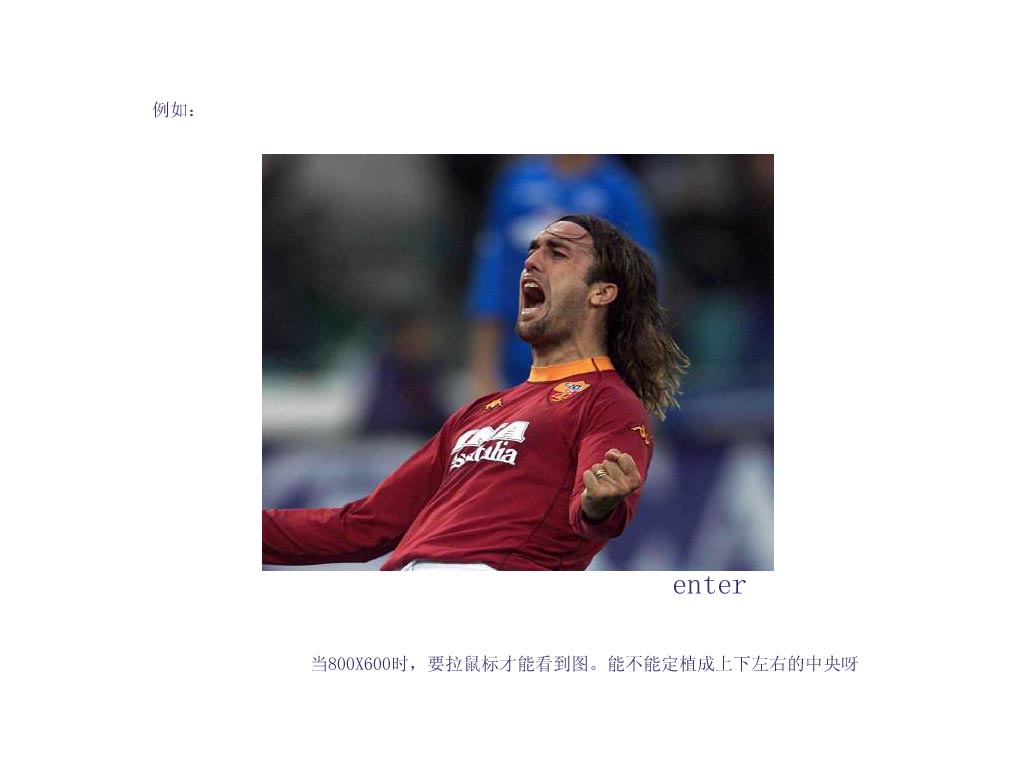 怎么可能出现这种情况呢?  如果只有图片的话,设置为背景图片。 加如下css,绝对居中 body{background-position:center center;background-image:url(badi.gif);backgound-repeat:no-repeat} ps:巴蒂,我喜欢!只是这个赛季到目前没有任何发挥,sign……