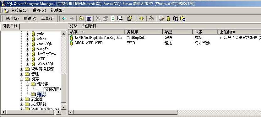 (首先声明我的系统是繁体的!)我的数据库不知被何人加了一个订阅,以致我的很多东西的乱七八糟的!我要把它删掉,可是看了半天说明也不知道怎么删,大伙帮帮忙啊!(PS:发行集为空,无任何资料)