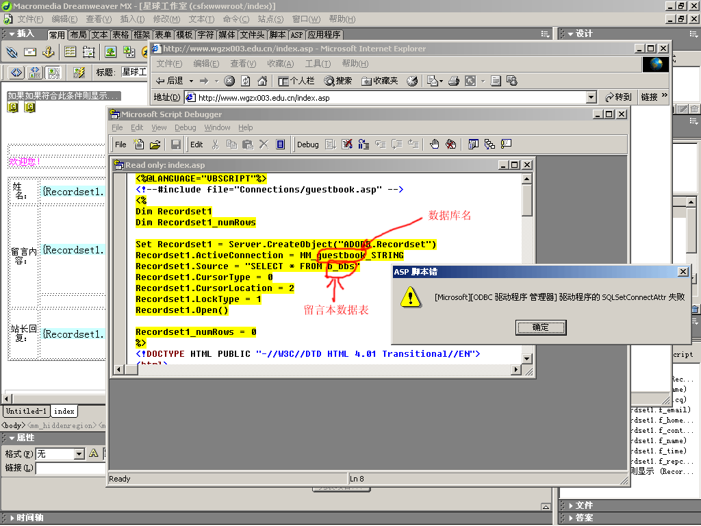 我按照《用Dreamweaver MX打造自己的个性留言本(一)》文章的介绍制作了自己的留言本,但是在服务器(win2000高级服务器)测试时,出现数据库链接不上的问题,见图: