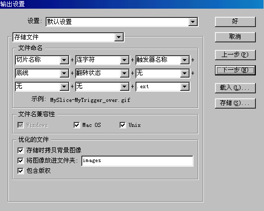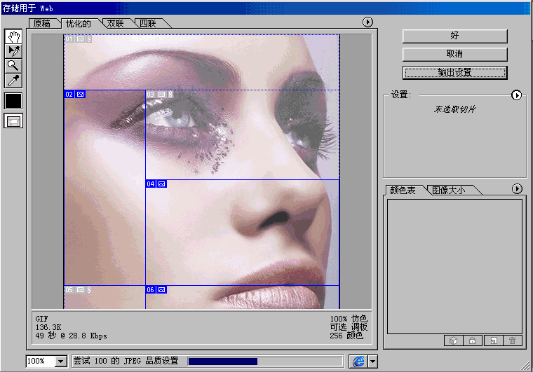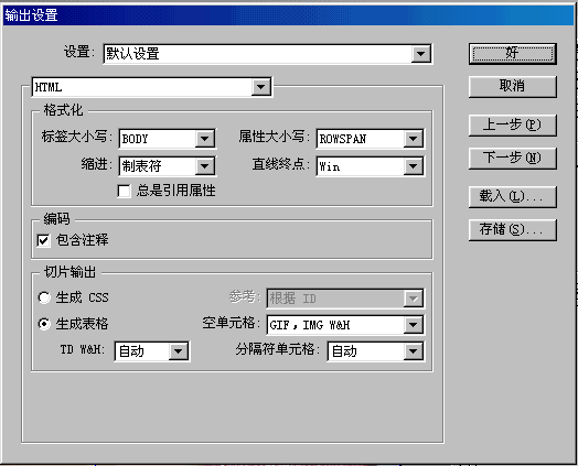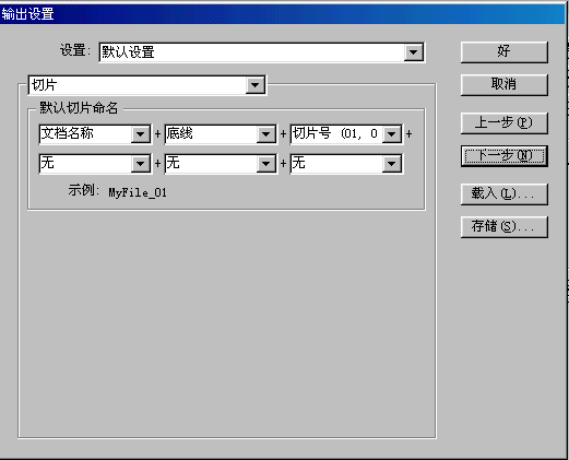 我按DENCO 说的做了一下“另存为web格式”可以保存成网页形式,但是保存的文件只有一个web形式的,没有图片的文件夹呀! 怎么才能得到被切割的图片? 还有就是点“另存为web格式”后出现一下对话框!请各位帮忙看一下。谢谢大家。