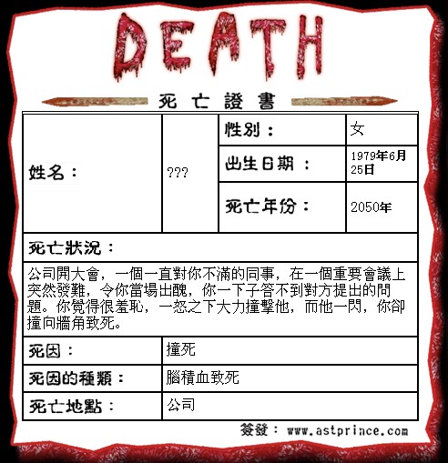 死亡年份:2050年 原因:公司開大會,一個一直對你不滿的同事,在一個重要會議上突然發難,令你當場出醜,你一下子答不到對方提出的問題。你覺得很羞恥,一怒之下大力撞擊他,而他一閃,你卻撞向牆角致死。 死因:撞死 我那么大年纪了还在公司啊??哈哈