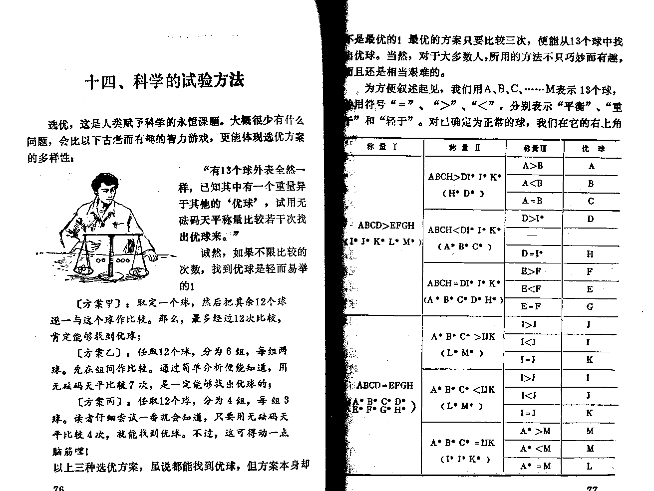 有13个小球,其中一个小球和12个小球不一样重,在天平上让你称三次,找出这个不一样重的小球来。