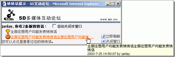 根据实际需求自动选择方式:(1)如果只有一条新悄悄话,则这个选项被自动选中。(2)如果有多于一条的新悄悄话,则选项不选中,以方便在查看第一条悄悄话后可继续查看下一条;