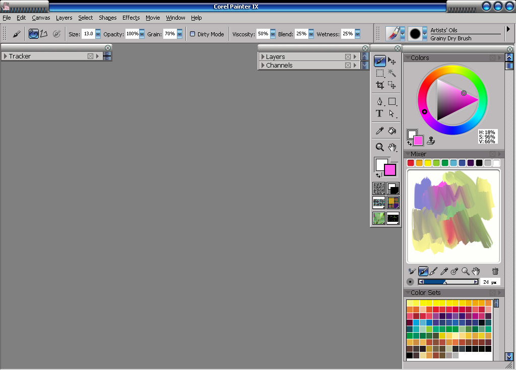 painter的调色系统应该是所有平面绘画软件中最人性化,也是最直观的。colors面板的调节把色相(色相环),明度,纯度都分得很明确。mixer的调色也很直观,还有color sets面板的取色。 我比较奇怪,你不适应在哪里?如果说painter 6之前的版本是用CTRL键点击取色的话,painter 7开始就改ALT键取色了。 图片如下:
