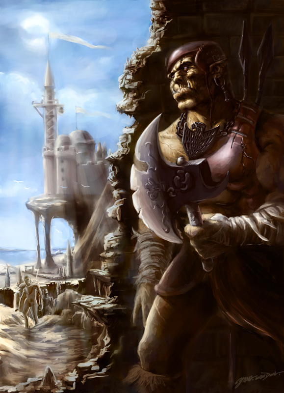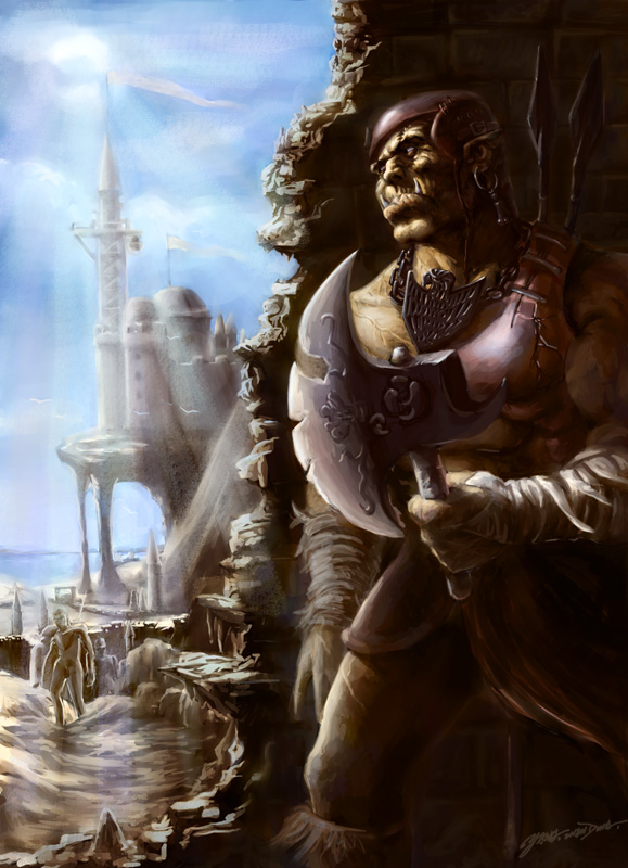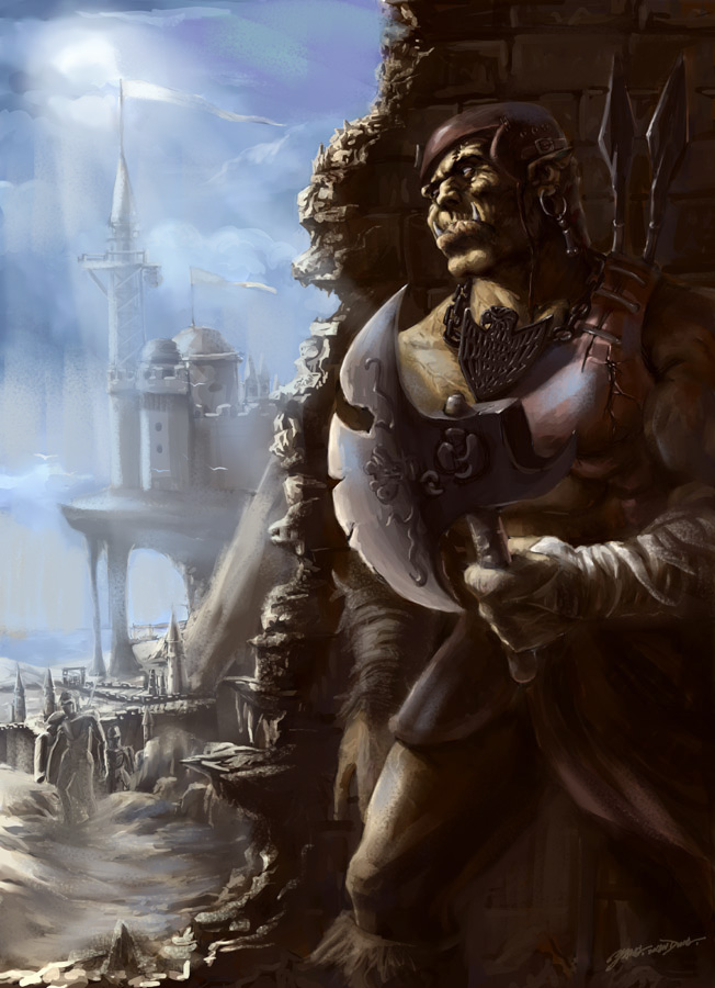 大致说明几个观点: 1.残壁的受光部分太亮,你要了解材质的基本感觉,石头不会有这么强的反射光源。 2.远景部分我做了更多的省略,其他部分我也是做了更多的减法。有时候,深入是在做减法,而不是一味地去增加细节。 3.在复杂的元素构图中,整体的层次感一定要把握好。视觉中心一定要明确,抓住重点,突出重点。对于非重点的部分,要敢于合理地省略。 图片如下: