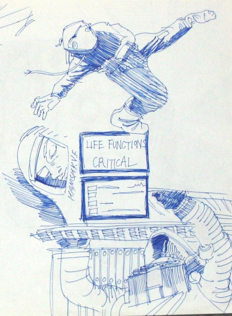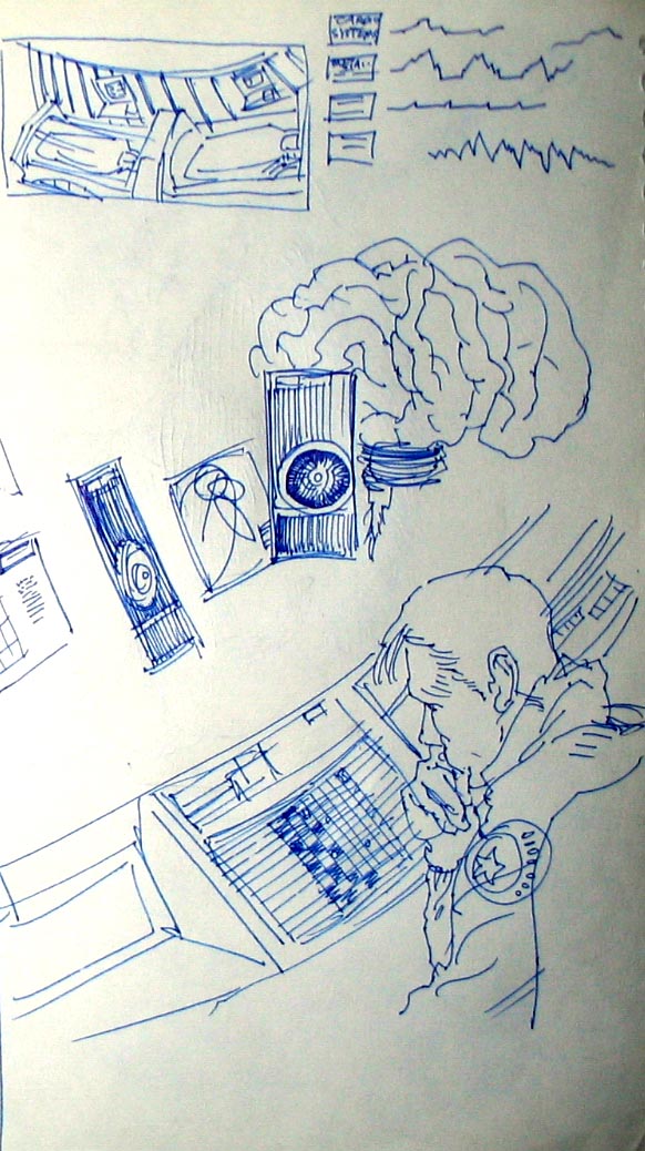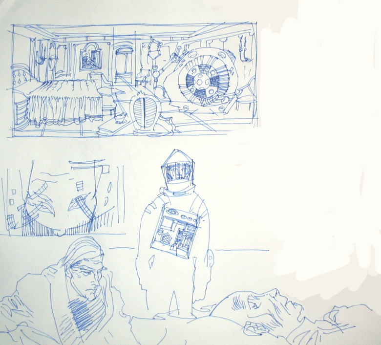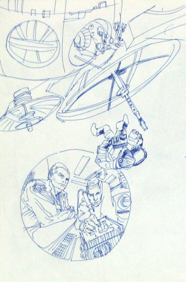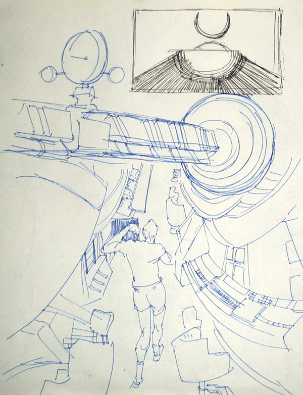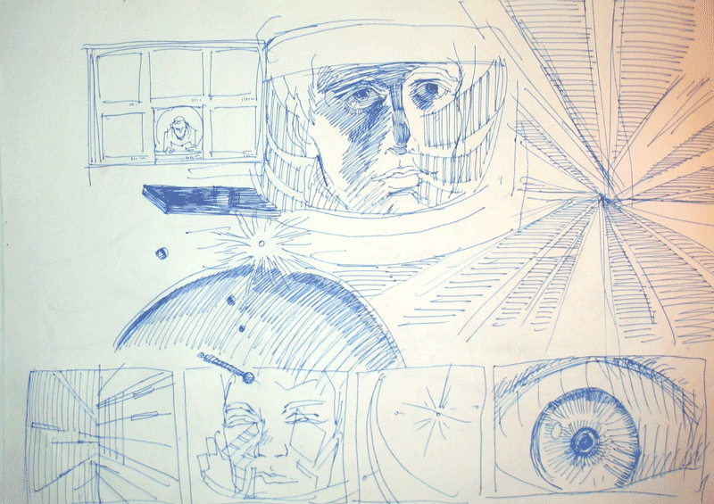 关于这个8页的”连环画“,我画了4个小时,平均半个小时一幅,仔细考虑了构图但没有十分认真的画,工具也不行,是支圆珠笔,不能画大面积的黑色并表现粗细不同的线条。在这个帖子里我会把《2001》的上半部补充完整的。