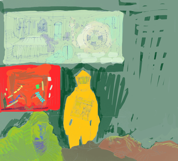 7。景色消失,震惊的大卫才发现自己来到了一间古典的室内。他发现自己满脸皱纹,当他向另一房间看时,他发现了另一个满头白发的他。满头白发的,更老的大卫打碎了一个酒杯,他看了看地上,突然发现床上还有一个他——一个老朽的他。