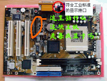 bigpotato说得对,这是AMR扩展槽,它提供的是声卡和modem在物理上公共的部分,可以节省这些外设的投资。 普通AGP槽只是比PCI槽短一点,扩展的更长。这个图中明显不是AGP 看这个图: 图片如下:  蓝色接旋钮就是和显示器的接口,说明这块主板集成显卡。